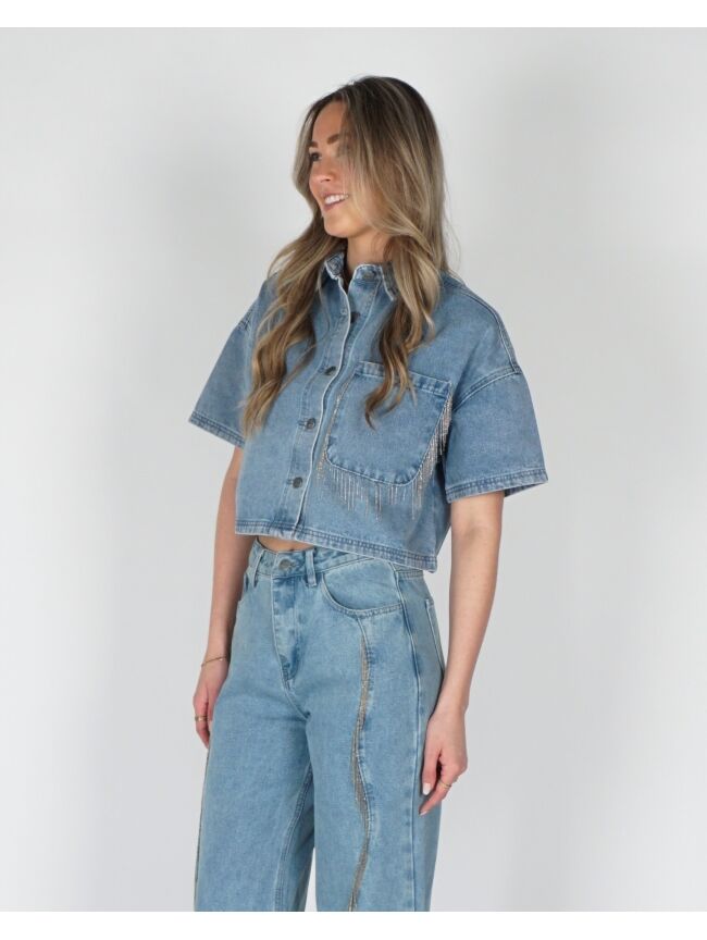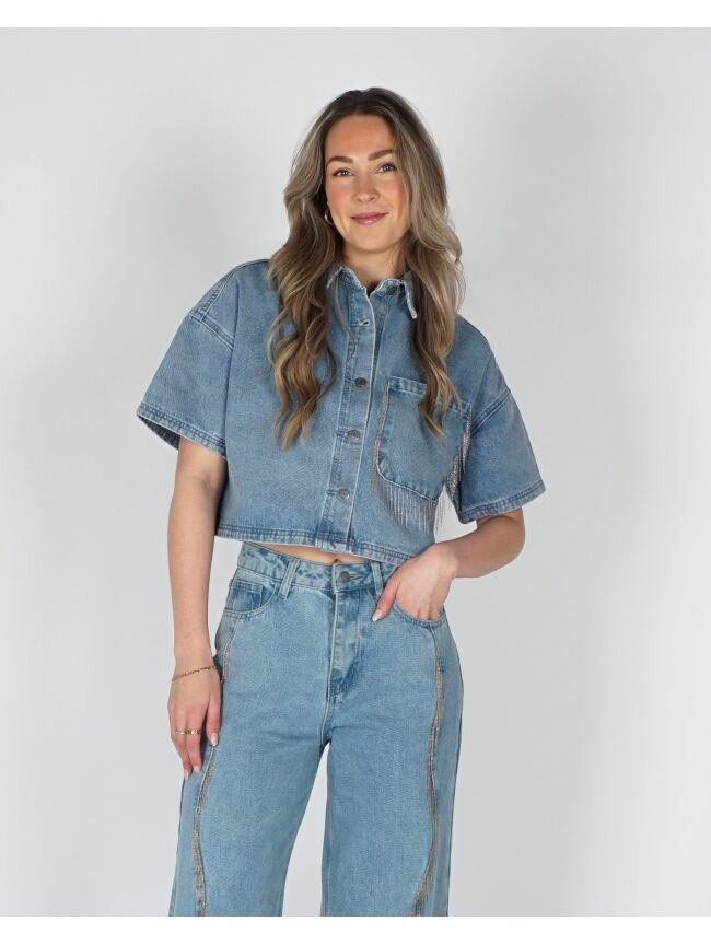 De Adeline denim blouse in lichtblauw heeft een stoere maar speelse uitstraling. De franjes rondom de borstzak geven de blouse een leuk detail. Combineer met de bijpassende jeans voor een complete denim set.