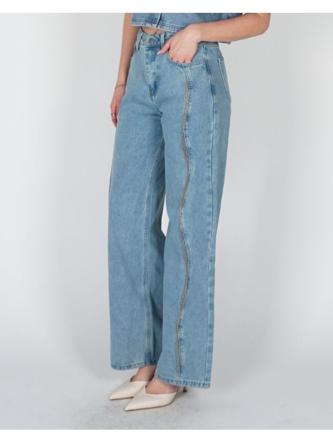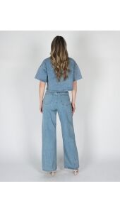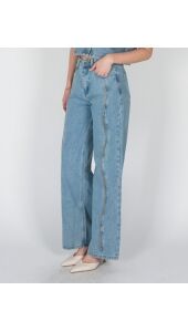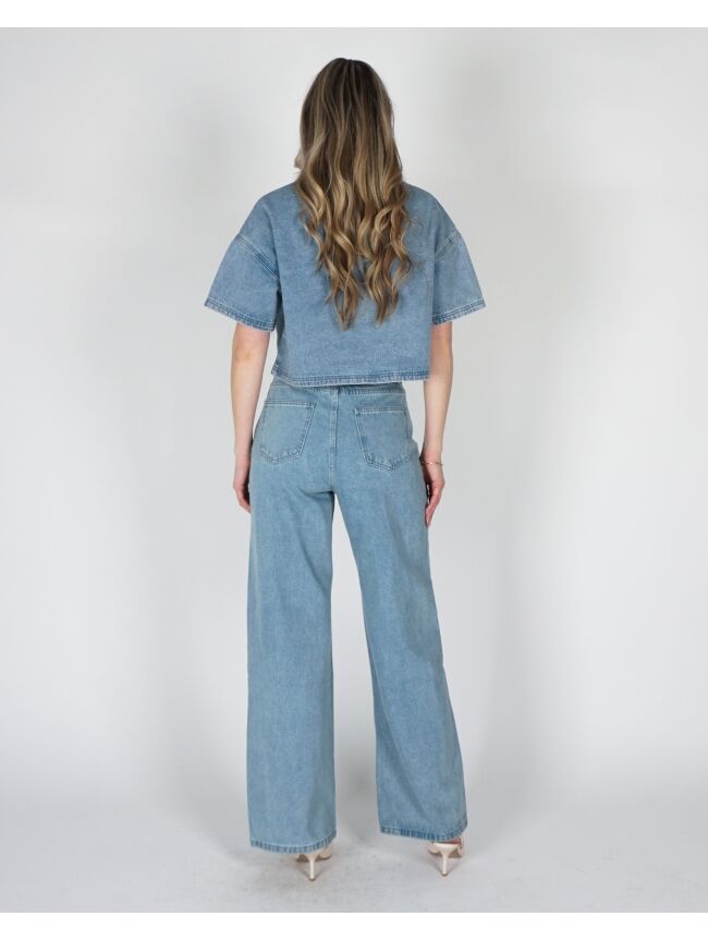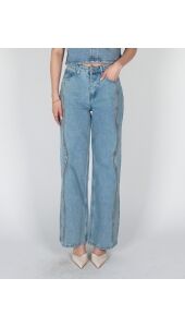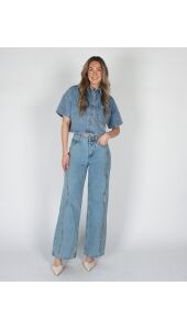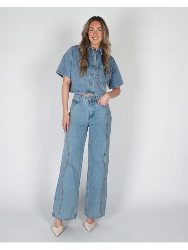 De Adeline denim jeans in lichtblauw heeft een stoere en trendy uitstraling. De franjes langs de zijkant van de pijpen geven de broek een speels detail. Combineer met de bijpassende blouse voor een complete denim set.