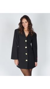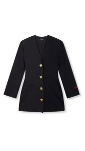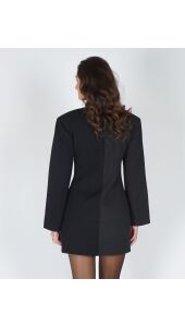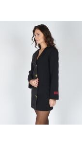 Deze fitted blazerjurk accentueert prachtig het figuur met haar getailleerde hourglass pasvorm. Het two-tone design, één zijde in klassiek zwart en de andere in grijs ruitpatroon, zorgt voor een opvallende, moderne look. De kraagloze snit geeft een elegante touch, terwijl het logo patch van katoen subtiel het geheel afmaakt. Een echte eyecatcher voor elke gelegenheid.