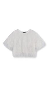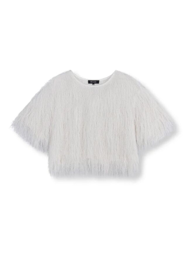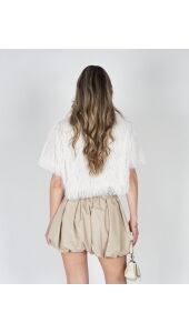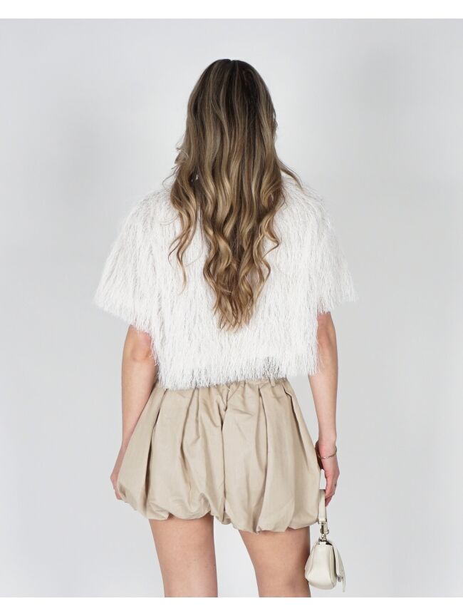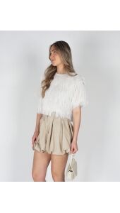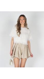 Stijlvolle witte top met een zachte, fluffy structuur die zorgt voor een trendy en opvallende look. De top heeft een comfortabele pasvorm en korte mouwen, waardoor hij perfect is voor zowel een casual als een chique outfit. Deze top is vooral leuk te combineren met de ballon short in het beige.