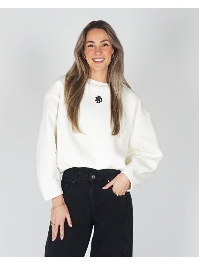 De Sweater Sellie heeft een fijne oversized pasvorm en speelse ballonmouwen voor een moderne, comfortabele look. De plooitjes aan de onderkant zorgen dat de sweater mooi valt, terwijl de ribhals en het logo op de borst een subtiele, stijlvolle touch geven. Een heerlijke sweater voor elke dag.