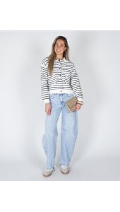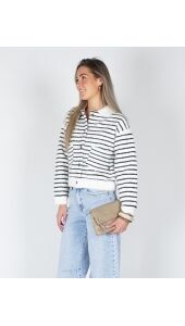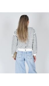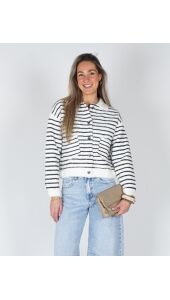 Super zacht en kort gebreid jasje. Dit gezellige zwart wit gestreepte jasje heeft een boxy silhouet, een platte kraag, een knoopsluiting, twee open voorzakken, een knoopsluiting op elke manchet en knoopdetails op de achterkant.