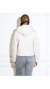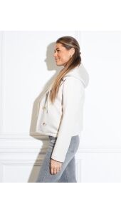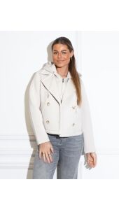 Chique double-breasted jas in een modern scuba-achtig materiaal. Heeft een veelzijdige afneembare capuchon met trekkoorden en twee verwijderopties. Inclusief steekzakken aan de zijkant en veilige knoopsluiting voor stijl en functionaliteit.