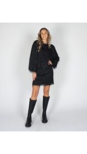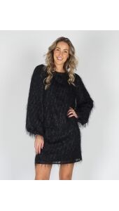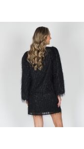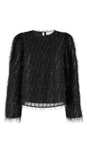 De Velvet Blouse is een luxe blouse gemaakt van een glinsterende zwarte franje stof. De rijke textuur en subtiele glans maken deze blouse perfect voor de feestdagen. De blouse heeft een ronde hals. Kleine schoudervulling in de schourders. Mouwen lopen wijd uit. Aan de achterkant van de hals zit een subtiele knoopssluiting om de top gemakkelijk aan te krijgen.