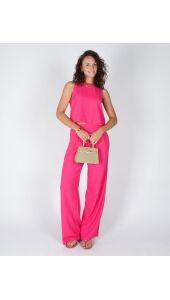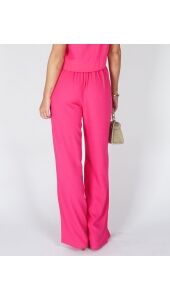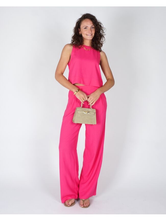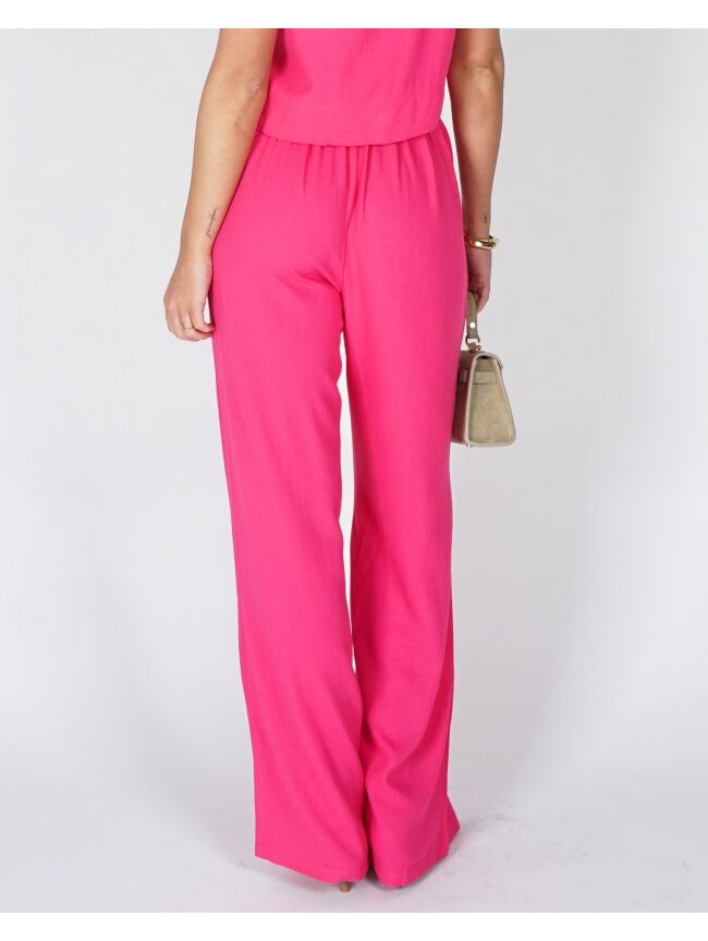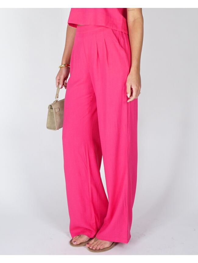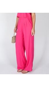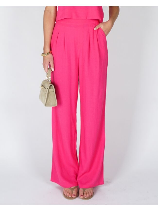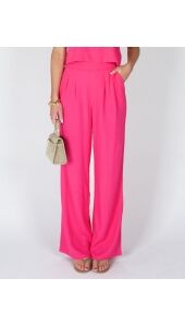 Deze stijlvolle fuchsia broek is de perfecte mix van comfort en elegantie. Het wijde model valt soepel langs het lichaam en zorgt voor een flatterende, luchtige look. De subtiele plooien aan de voorkant geven de broek een chique uitstraling, terwijl de elastische tailleband zorgt voor een comfortabele pasvorm. Combineer hem met de bijpassende top voor een krachtige en trendy co-ord set.