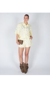 Deze vrolijke short in lichtgeel is voorzien van kleine glinsterende steentjes voor een speels effect. De losvallende fit en elastische taille zorgen voor ultiem draagcomfort. Combineer met de bijpassende blouse voor een complete look.