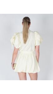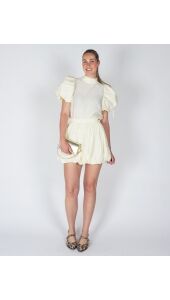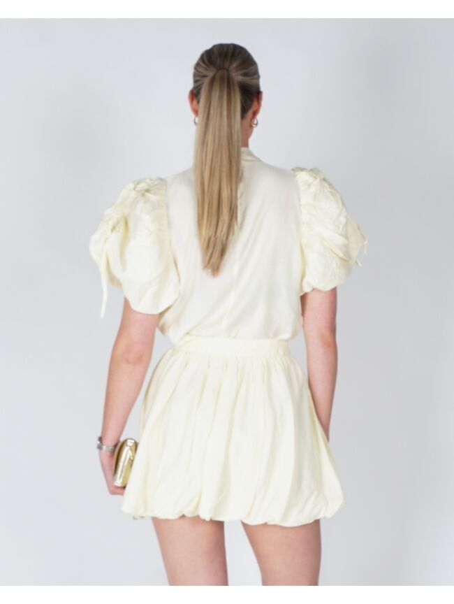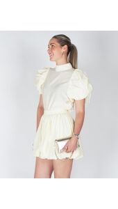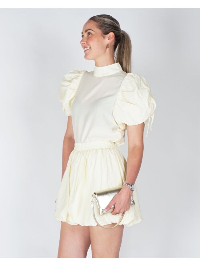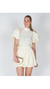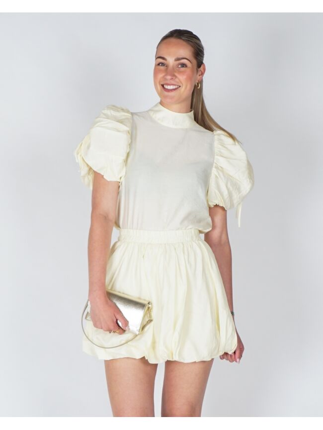 Deze stijlvolle licht gele top straalt pure elegantie uit met een speelse twist. De opvallende pofmouwen geven de top een trendy en vrouwelijke look, terwijl de hoge hals zorgt voor een chique en verfijnde uitstraling. De luchtige stof voelt comfortabel aan en valt mooi langs het lichaam. Perfect te combineren met het bijpassende skortje.