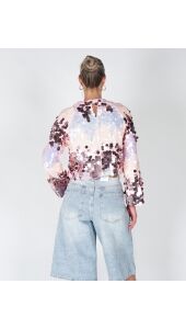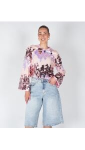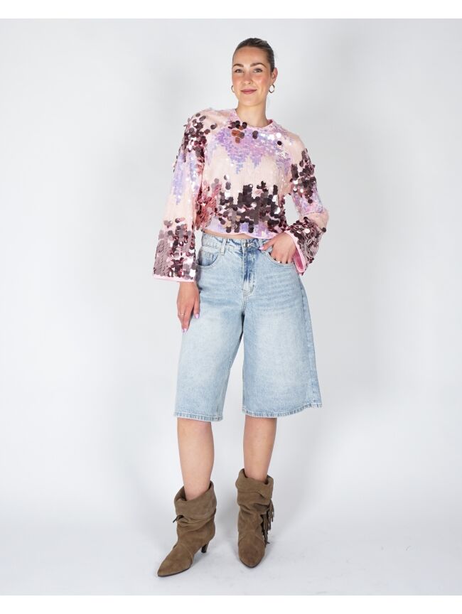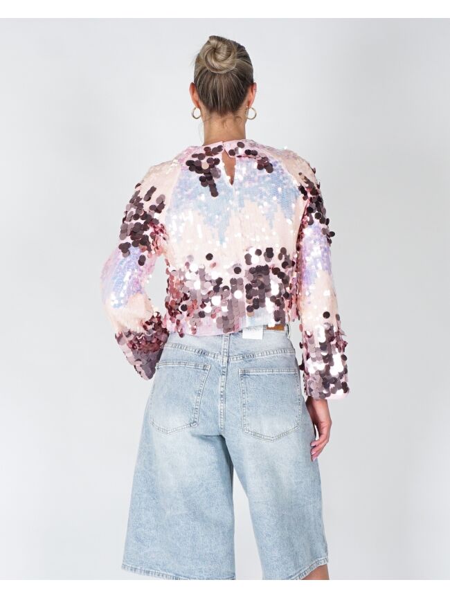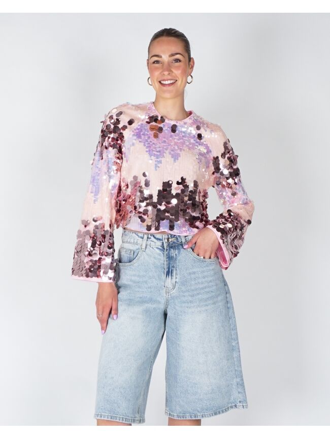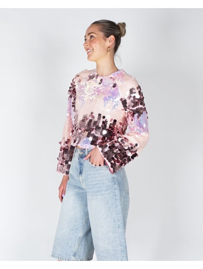 Deze sprankelende top met all-over pailletten is een echte eyecatcher. Het cropped model en de wijde mouwen geven een trendy en speelse look. Perfect voor een feestelijke outfit of casual chic met een jeans.