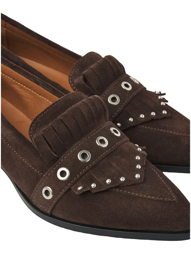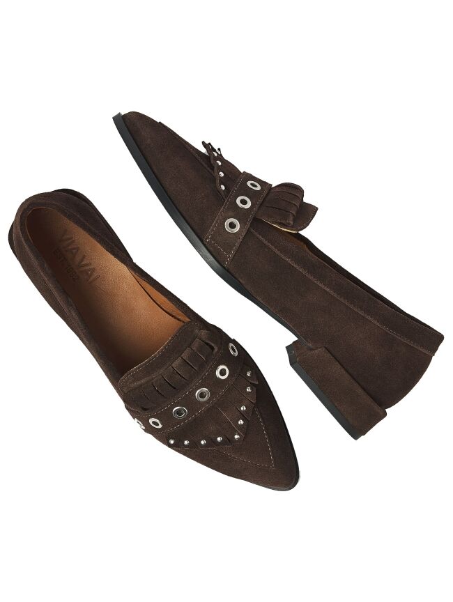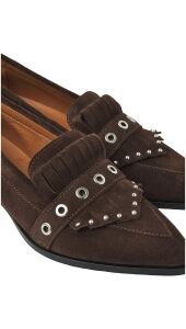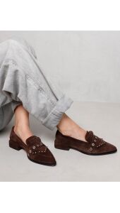 Western meets classy! Maak kennis met Jazz Emily, de statement loafer die jouw outfit nét dat beetje extra pit geeft. Deze donkerbruine allrounder is uitgevoerd in hoogwaardig suède en valt op door de eyecatching details. De spitse neus en het subtiele blokhakje zorgen voor een elegante, vrouwelijke look, terwijl de zilverkleurige studs en eyelets juist een stoere twist geven.