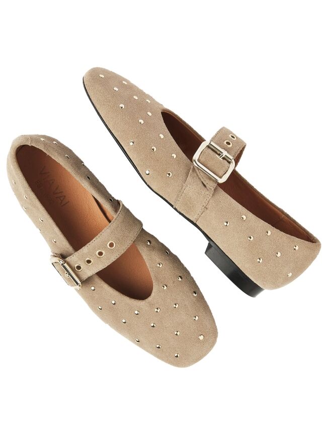 Verfijnd, elegant en helemaal on trend: zo omschrijven we Lou Nina. Deze beige ballerina’s zijn gemaakt van luxueus suède en gedecoreerd met gouden studs voor een vrouwelijke look. Het verstelbare bandje op de wreef geeft de ballerina een stoere touch. Dankzij het lage blokhakje en het foamed leren voetbed lopen de ballerina’s heerlijk. De stijlvolle rechte neus maakt de look compleet.