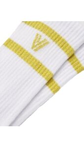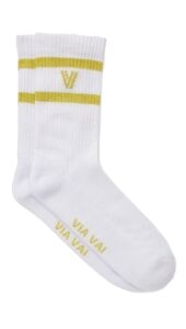 Sporty meets feminine met Lauren Kenna. Deze stylish sokken zijn de finishing touch van jouw outfit. De zachte sokken zijn gemaakt van een katoenmix en afgewerkt met een ribbed patroon voor een sportieve look. Lauren Kenna valt op dankzij de stoere gele strepen, waarin goudkleurig lurex is verwerkt. Het gekleurde VIA VAI logo net boven de enkel maakt de witte sokken af.