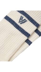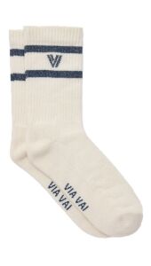 Sporty meets feminine met Lauren Kenna. Deze stylish sokken zijn de finishing touch van jouw outfit. De zachte sokken zijn gemaakt van een katoenmix en afgewerkt met een ribbed patroon voor een sportieve look. Lauren Kenna valt op dankzij de stoere blauwe strepen, waarin zilverkleurig lurex is verwerkt. Het gekleurde VIA VAI logo net boven de enkel maakt de crèmekleurige sokken af.