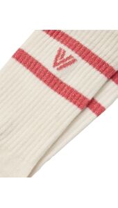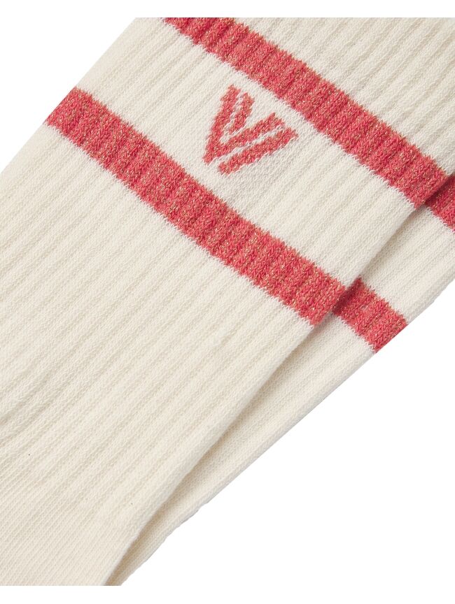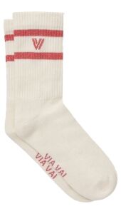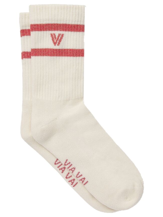 Sporty meets feminine met Lauren Kenna. Deze stylish sokken zijn de finishing touch van jouw outfit. De zachte sokken zijn gemaakt van een katoenmix en afgewerkt met een ribbed patroon voor een sportieve look. Lauren Kenna valt op dankzij de stoere rode strepen, waarin zilverkleurig lurex is verwerkt. Het gekleurde VIA VAI logo net boven de enkel maakt de crèmekleurige sokken af. How to wear? Combineer Lauren Kenna met een sneaker voor een sportieve look. Match dit met cargo pants of een jeans met opgerolde pijpen om je sokken te laten rocken. Of style Lauren Kenna met een chunky loafer en een midi rok voor een stoer geheel.