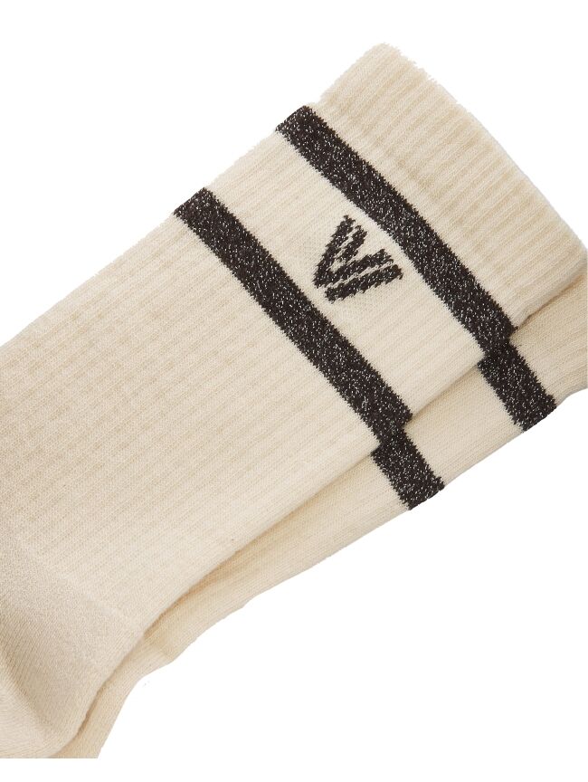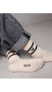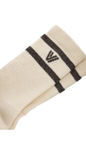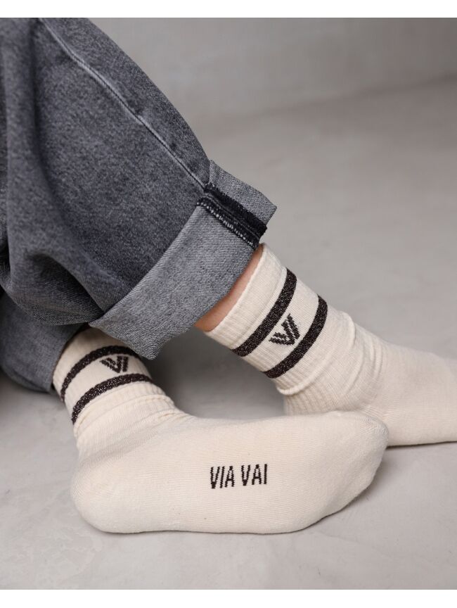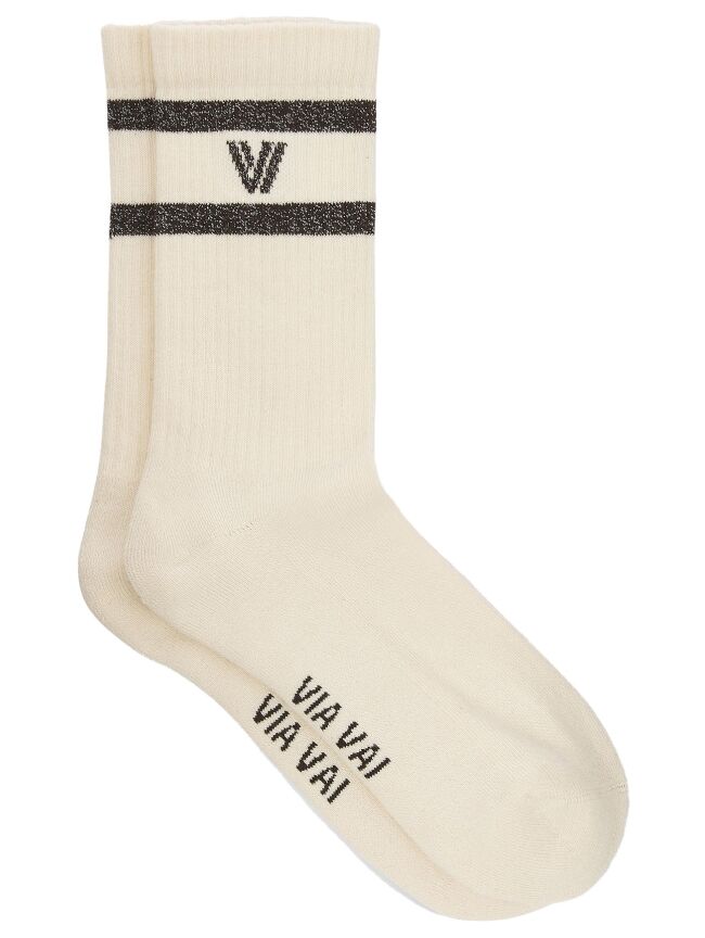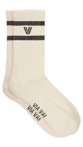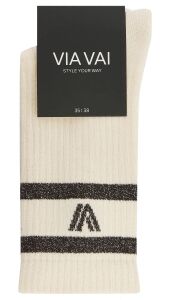 Sporty meets feminine met Lauren Kenna. Deze stylish sokken zijn de finishing touch van jouw outfit. De zachte sokken zijn gemaakt van een katoenmix en afgewerkt met eenribbed patroon voor een sportieve look. Lauren Kenna valt op dankzij de stoere donkerbruine strepen, waarin zilverkleurig lurex is verwerkt. Het gekleurde VIA VAI logo net boven de enkel maakt de crèmekleurige sokken af.