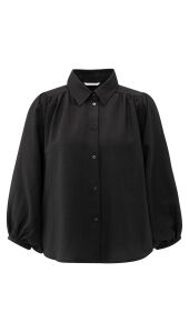 Deze blouse met pofmouwen combineert elegantie met een speels detail. De driekwart pofmouwen en subtiele plooien bij de schouders geven karakter, terwijl de klassieke kraag, knoopsluiting en rechte pasvorm zorgen voor een tijdloze, comfortabele look.