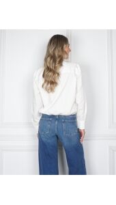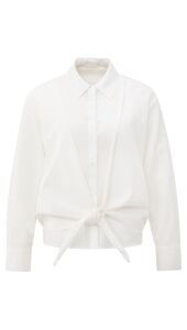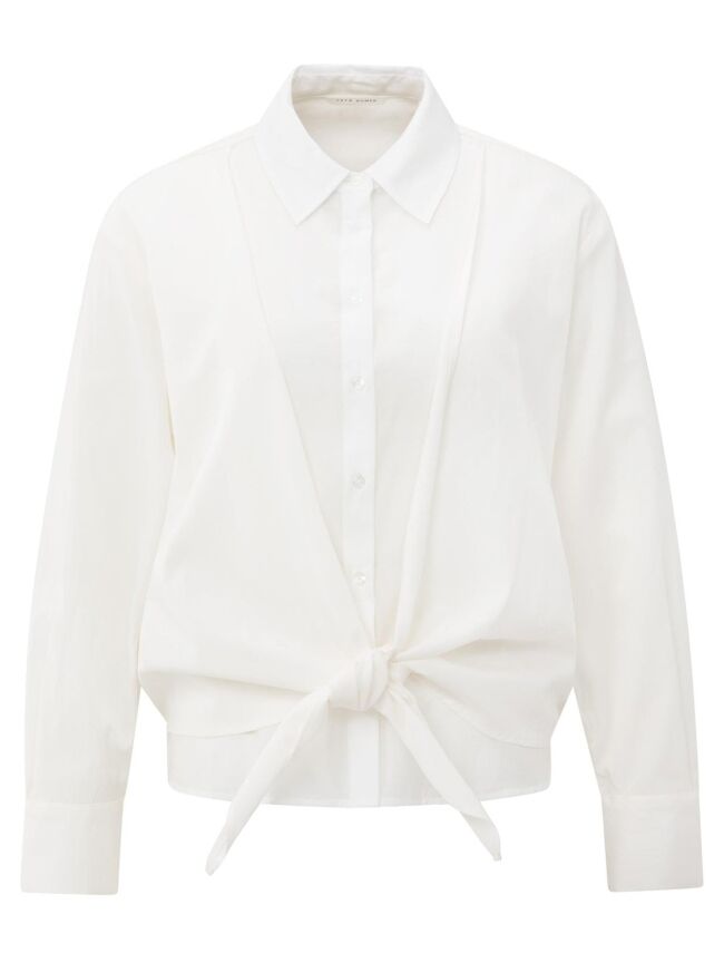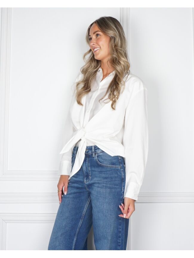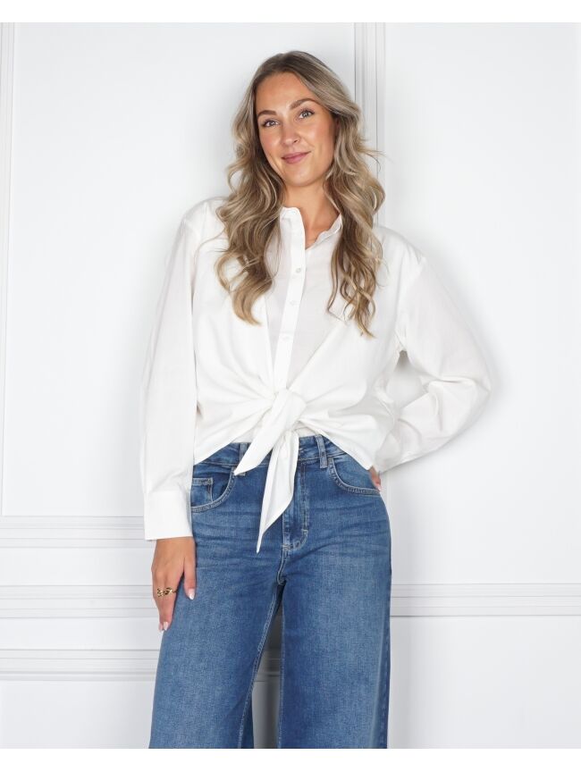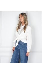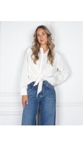 Deze elegante blouse heeft een gelaagd design met een openvallend voorpand dat speels wordt geknoopt. Gemaakt van een luchtige stof en voorzien van een klassieke kraag, lange mouwen met manchetten en een losse pasvorm. De blouse valt op heuplengte en creëert een stijlvolle, nonchalante look.