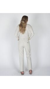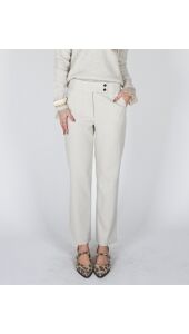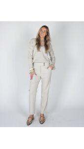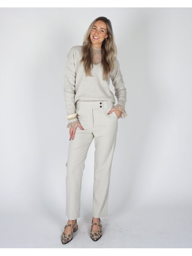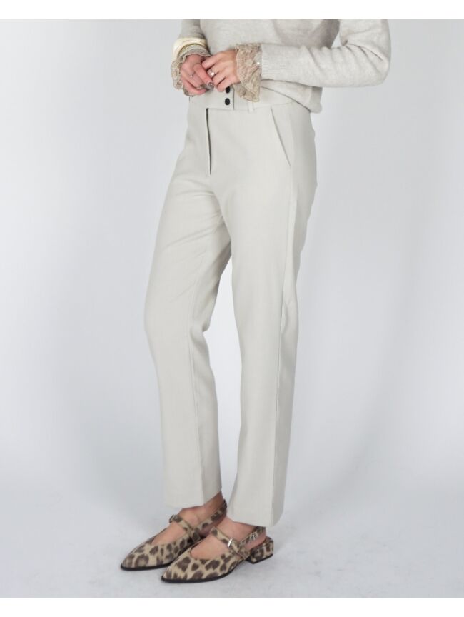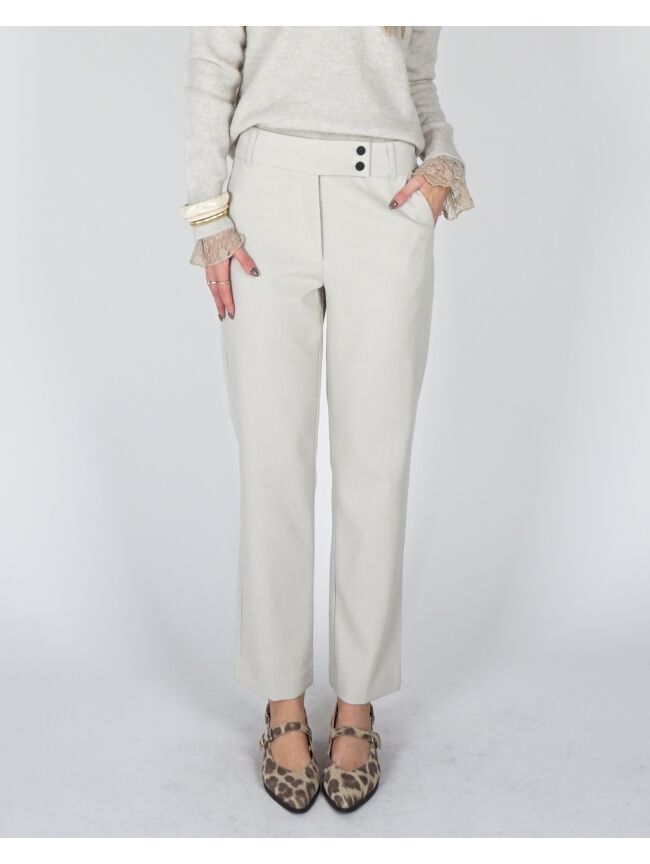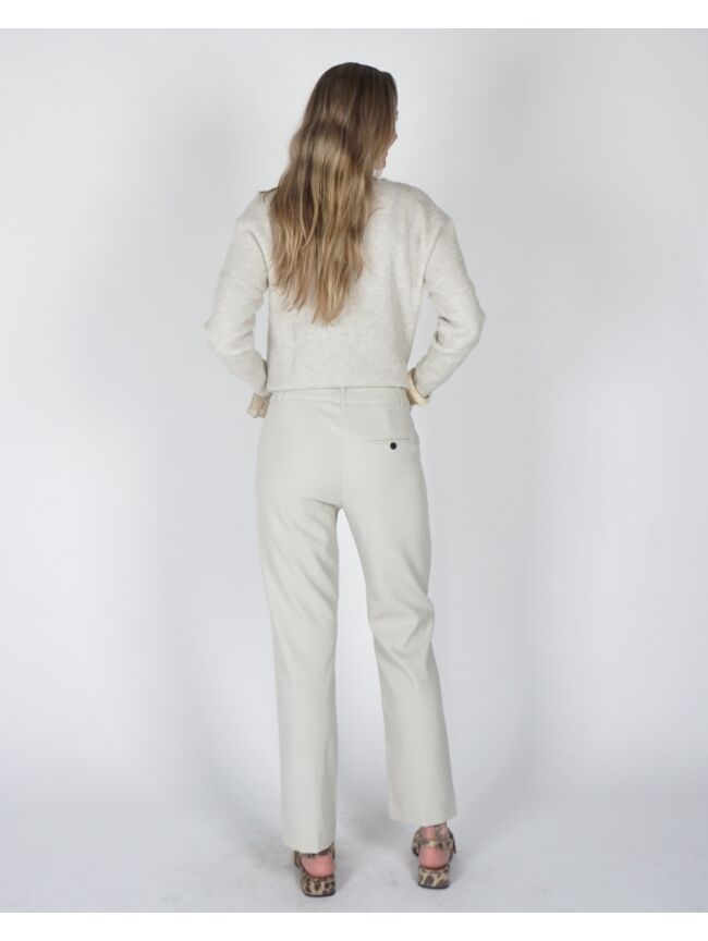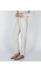 Deze rechte broek met hoge taille straalt moeiteloze elegantie uit. De luchtige stof en dubbele knoopsluiting geven een moderne twist, terwijl de persvouwen zorgen voor een mooi, vrouwelijk silhouet. Draag hem zakelijk met een blouse of casual met een trui, altijd stijlvol, altijd verfijnd.