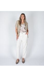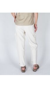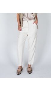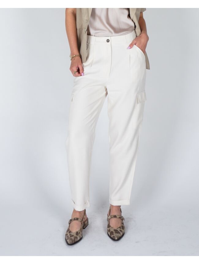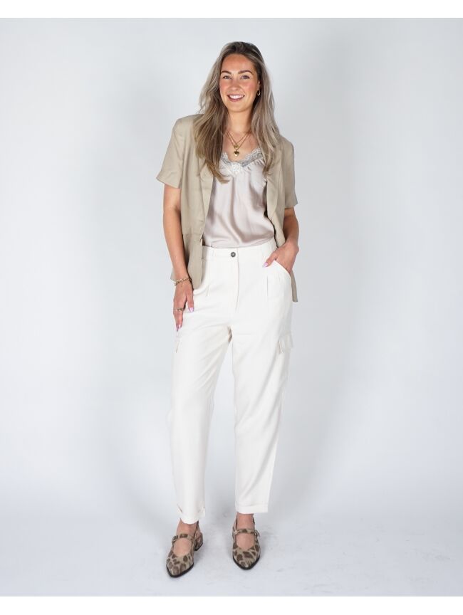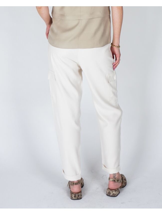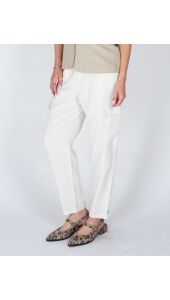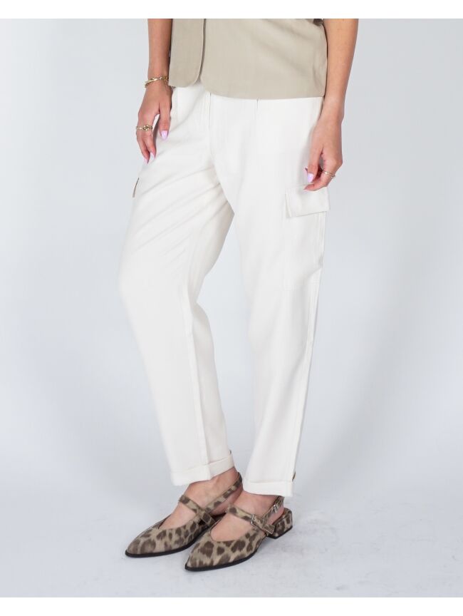 Deze comfortabele cargobroek is gemaakt van een zachte, soepelvallende geweven stof. Het model heeft rechte pijpen en plooien aan de voorkant voor een vrouwelijke touch, en is afgewerkt met cargozakken en omgeslagen zoom voor een casual uitstraling. De elastische tailleband achter zorgt voor extra comfort. Voorzien van steekzakken en paspelzakken achter.