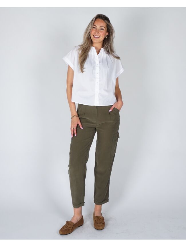 Deze comfortabele cargobroek is gemaakt van een zachte, soepelvallende geweven stof. Het model heeft rechte pijpen en plooien aan de voorkant voor een vrouwelijke touch, en is afgewerkt met cargozakken en omgeslagen zoom voor een casual uitstraling. De elastische tailleband achter zorgt voor extra comfort. Voorzien van steekzakken en paspelzakken achter.