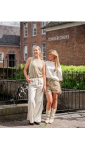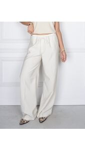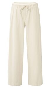 Deze elegante broek heeft wijde pijpen, een losse pasvorm en is gemaakt van een luchtige geweven stof. De elastische tailleband met trekkoord wordt verfraaid met een glanzende satijnen binnenband, wat een subtiele luxe uitstraling geeft. Steekzakken zorgen voor extra gemak. Een veelzijdig item voor zowel casual als chique looks.