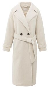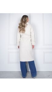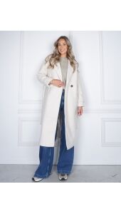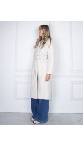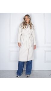 Deze stijlvolle lange jas is uitgevoerd in een zachte bouclé stof en heeft een oversized pasvorm. Het ontwerp is voorzien van een klassieke reverskraag, dubbele knoopsluiting en een bijpassende ceintuur voor een vrouwelijke taille. Afgewerkt met manchetdetails en steekzakken voor een elegante en comfortabele najaarslook.