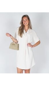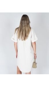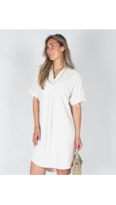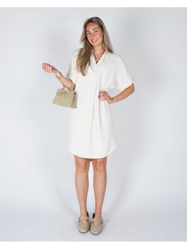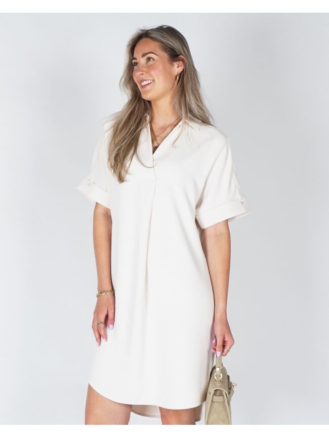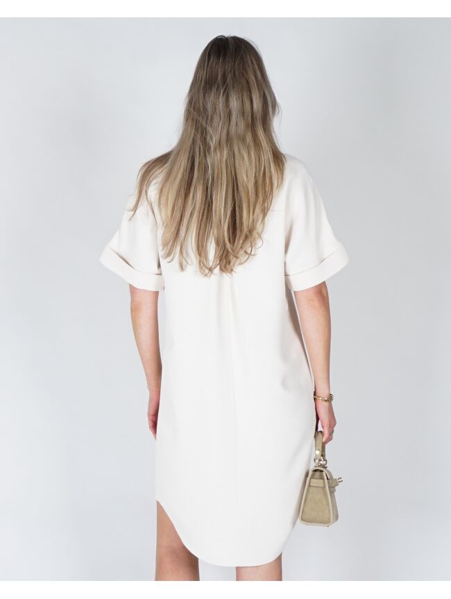 Deze elegante jurk heeft een V-hals, korte mouwen met subtiele plooidetails en een losse pasvorm. Het model valt lang en recht, wat zorgt voor een comfortabele en flatterende uitstraling. De minimalistische afwerking en zachte valling geven de jurk een verfijnde look. Een veelzijdig item dat je zowel casual als gekleed kan dragen.