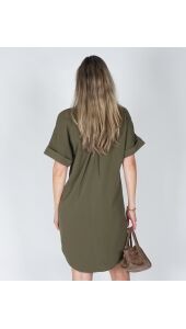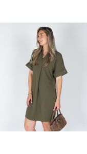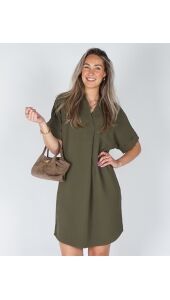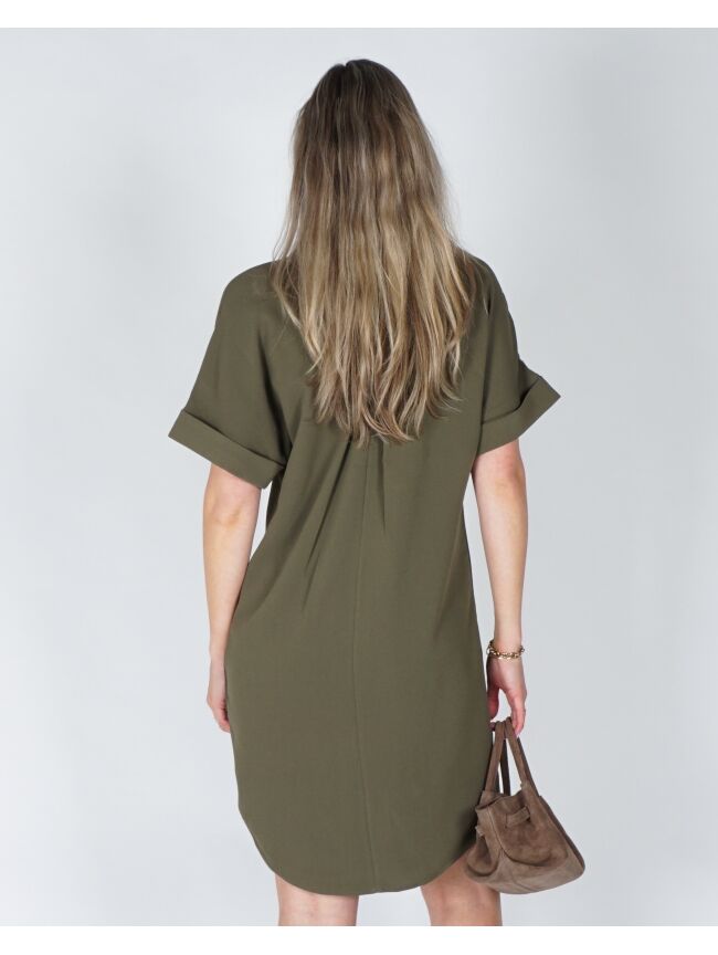 Deze elegante jurk heeft een V-hals, korte mouwen met subtiele plooidetails en een losse pasvorm. Het model valt lang en recht, wat zorgt voor een comfortabele en flatterende uitstraling. De minimalistische afwerking en zachte valling geven de jurk een verfijnde look. Een veelzijdig item dat je zowel casual als gekleed kan dragen.