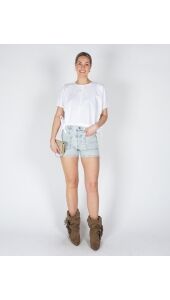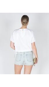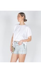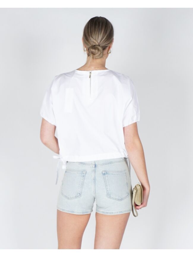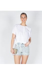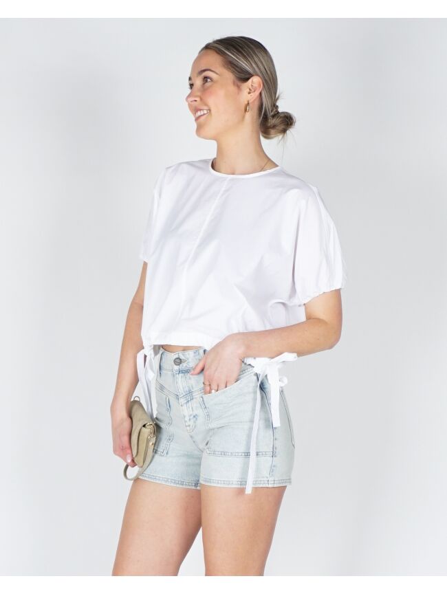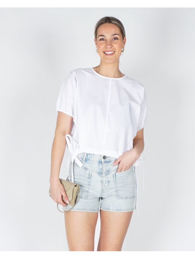 Deze boxy top heeft een ronde hals, korte pofmouwen en een oversized pasvorm. Het model heeft een kortere lengte en is aan de onderzijde voorzien van verstelbare strikkoorden, waarmee je de taille subtiel kunt aanpassen. De lichte, luchtige uitstraling geeft de top een moderne en speelse look. Perfect voor een eigentijdse, casual styling.