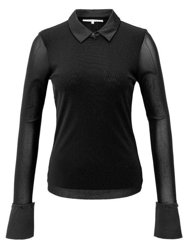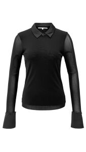 Deze mesh top met afneembare kraag en manchetten combineert elegantie met veelzijdigheid. De lange, transparante mouwen en aangesloten pasvorm zorgen voor een vrouwelijke look, terwijl het lichte materiaal hem perfect maakt voor zowel casual als chique outfits. Draag hem met of zonder kraag en manchetten voor een speelse twist.