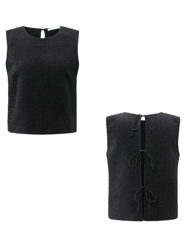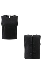 Deze mouwloze top met strikdetail combineert comfort met een moderne, vrouwelijke uitstraling. De rechte pasvorm, ronde hals en open rug met drie striksluitingen maken hem perfect om te dragen over een blouse of top voor een trendy, gelaagde look.