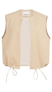Dit mouwloze zomerjack heeft een oversized pasvorm en is gemaakt van een luchtige geweven stof. De ronde halslijn, de open voorkant en de trekkoorden aan de zoom zorgen voor een casual uitstraling. De decoratieve lus op de rug voegt een functioneel detail toe. Ideaal als licht laagje op warme dagen.