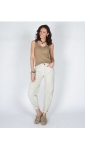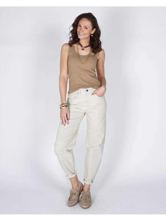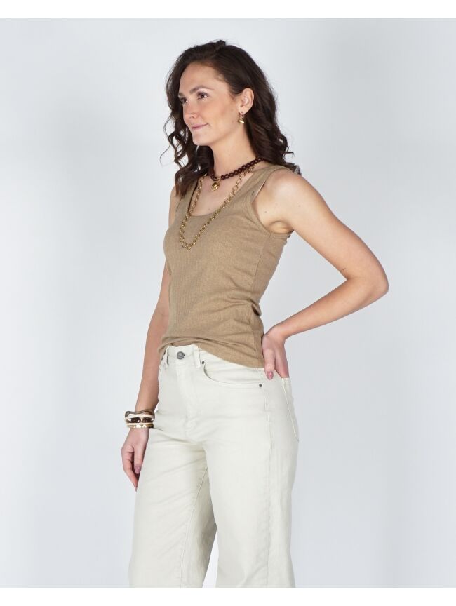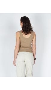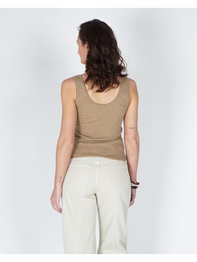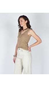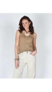 Deze top is gemaakt van een zachte, rekbare ribstof en heeft een aangesloten pasvorm. De halslijn en armsgaten zijn verfijnd afgewerkt met een sierlijk golvend randje, wat zorgt voor een vrouwelijke en elegante uitstraling. Perfect om solo te dragen op warme dagen of als basis onder een blouse of vest.