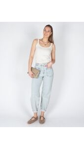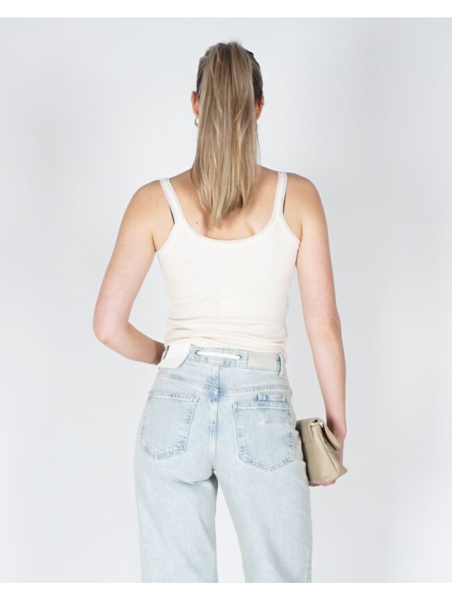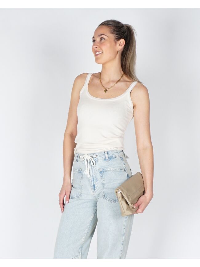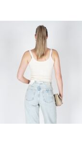Deze verfijnde singlet heeft brede schouderbandjes, een ronde hals en een aansluitende, vrouwelijke pasvorm. De subtiele mesh afwerking langs de hals en bandjes geeft het item een lichte en moderne uitstraling. De zachte, ribgebreide stof voelt comfortabel aan en maakt deze singlet ideaal om zowel solo te dragen als te combineren onder een blouse, vest of blazer.
