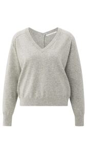 Deze zachte trui heeft een V-hals aan zowel de voor- als achterkant en een losse pasvorm. De knoopsluiting op de rug zorgt voor een verfijnd accent en maakt het item extra bijzonder. De lange mouwen en brede ribboorden geven een comfortabele en stijlvolle afwerking.