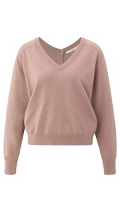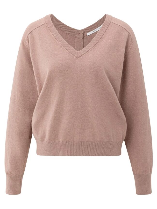 Deze zachte trui heeft een V-hals aan zowel de voor- als achterkant en een losse pasvorm. De knoopsluiting op de rug zorgt voor een verfijnd accent en maakt het item extra bijzonder. De lange mouwen en brede ribboorden geven een comfortabele en stijlvolle afwerking.
