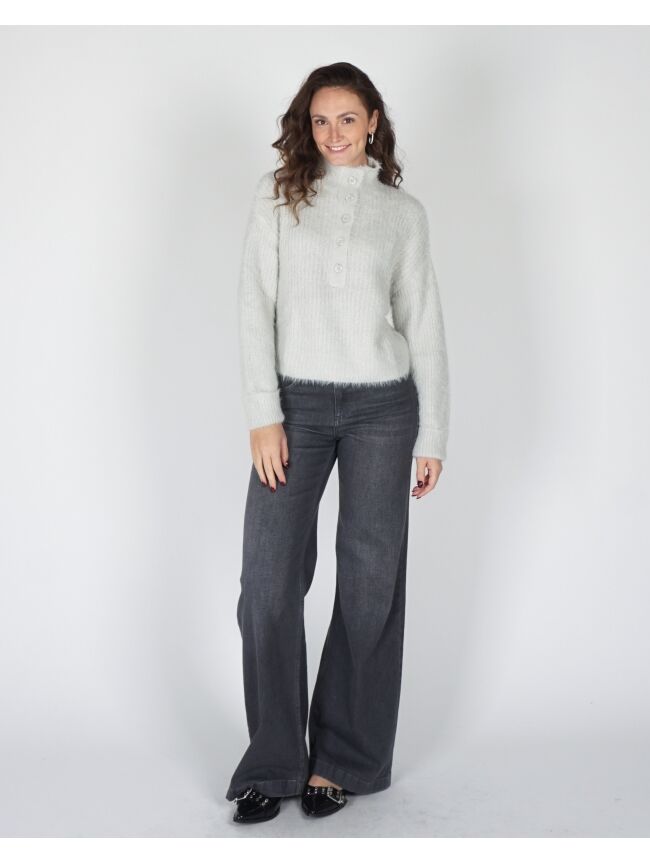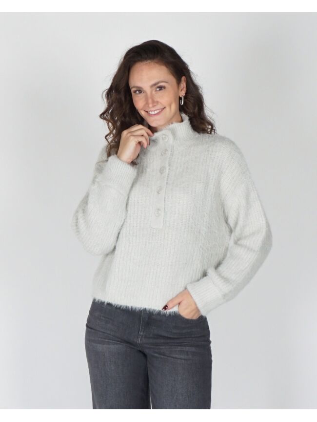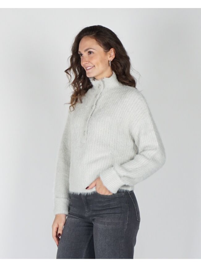 Deze fluffy trui met opstaande kraag combineert comfort met een moderne, elegante uitstraling. De korte pasvorm en lange mouwen met omgeslagen boorden geven een nonchalante touch, terwijl de knoopsluiting een subtiel stijlaccent toevoegt. Perfect voor een casual-chic look.