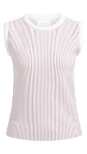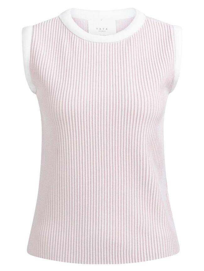 Deze fijngebreide trui zonder mouwen is uitgevoerd in een zachte ribstructuur en heeft een aangesloten pasvorm. De ronde hals en armsgaten zijn afgewerkt met contrasterende boorden voor een sportieve touch. Het model valt tot op de heup en is perfect voor een gelaagde look of om los te dragen.