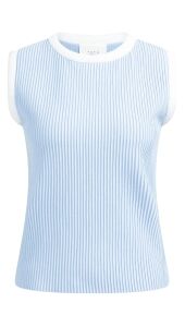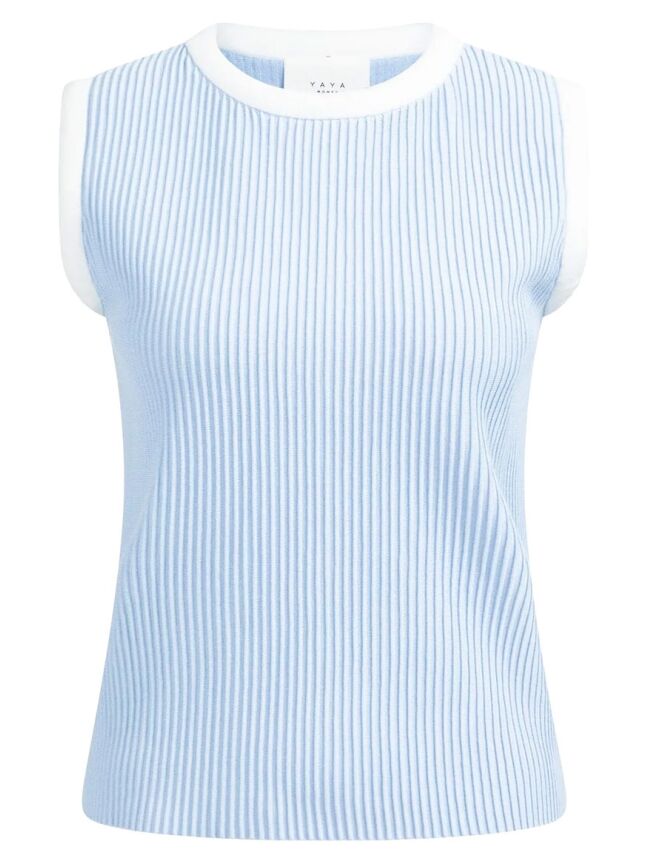 Deze fijngebreide trui zonder mouwen is uitgevoerd in een zachte ribstructuur en heeft een aangesloten pasvorm. De ronde hals en armsgaten zijn afgewerkt met contrasterende boorden voor een sportieve touch. Het model valt tot op de heup en is perfect voor een gelaagde look of om los te dragen.