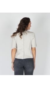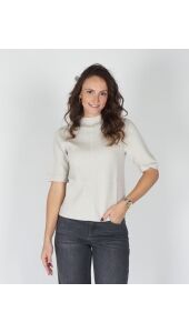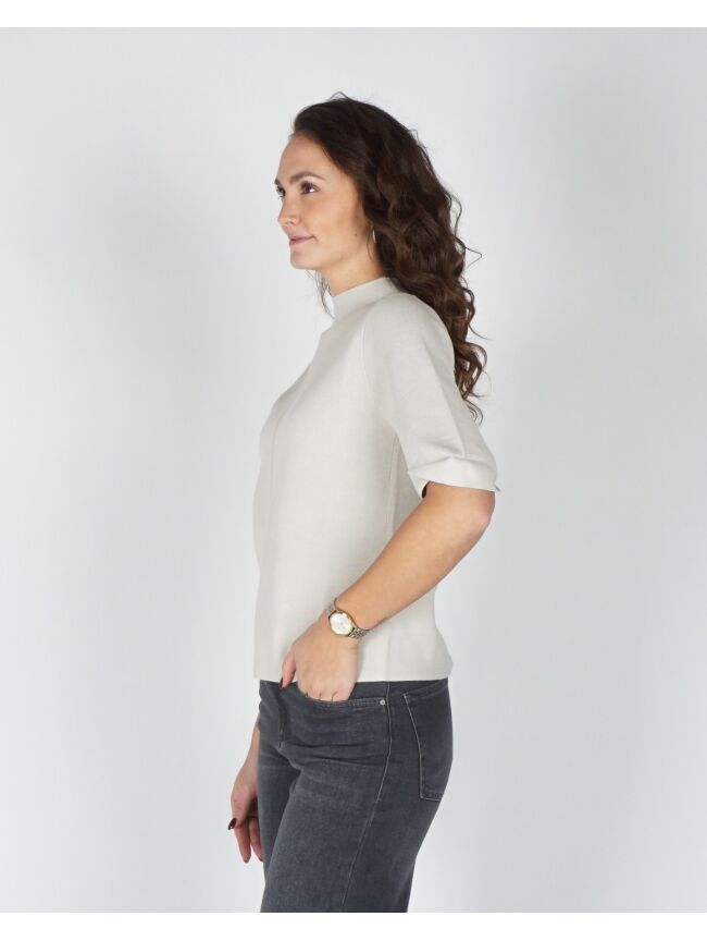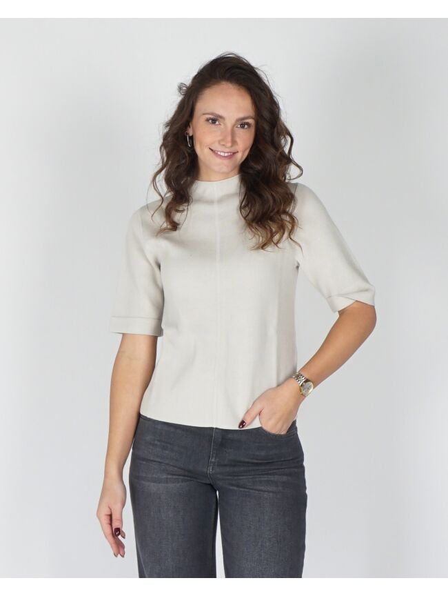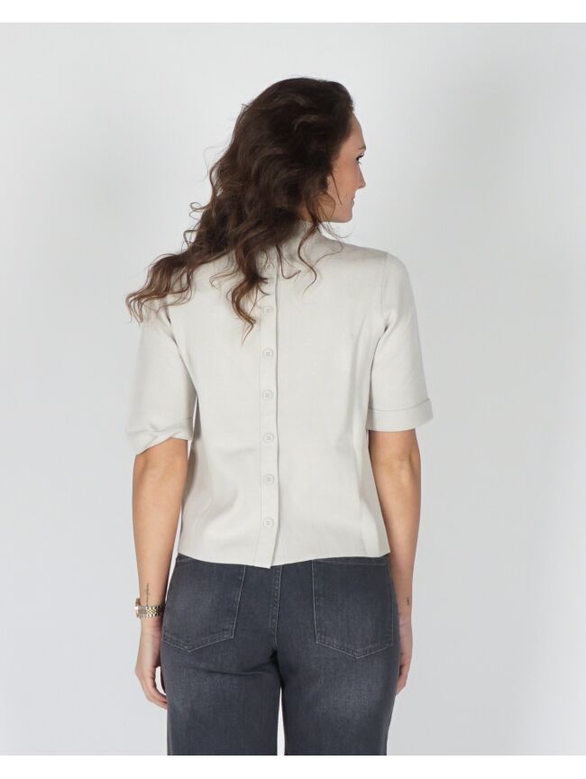 Deze fijngebreide trui combineert minimalistische elegantie met verfijnde details. De opstaande hals, halve mouwen met omslag en rechte pasvorm zorgen voor een tijdloze look, terwijl de knoopsluiting op de rug een subtiel, chic accent toevoegt. Ideaal voor zowel casual als nette outfits.