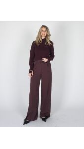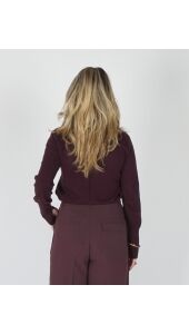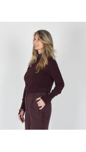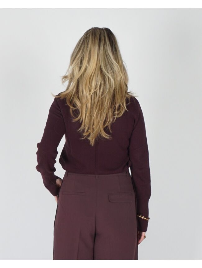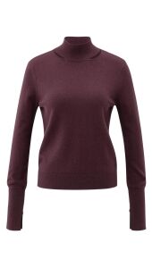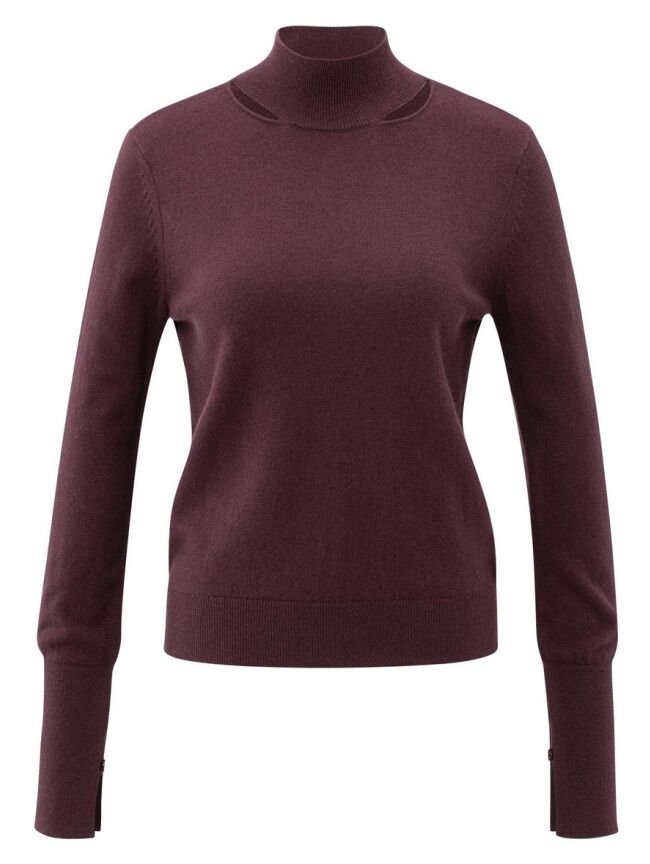 Deze fijngebreide trui in aubergine is gemaakt van een zachte wolmix en heeft een opstaande kraag met verfijnde cut-out halslijn. De getailleerde pasvorm en subtiele details, zoals ribboorden met kleine splitjes, zorgen voor een elegante en moderne uitstraling. Met zijn comfortabele regular lengte is dit een veelzijdig item dat moeiteloos stijl en comfort combineert, perfect voor een chique, alledaagse look.