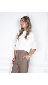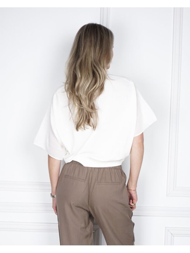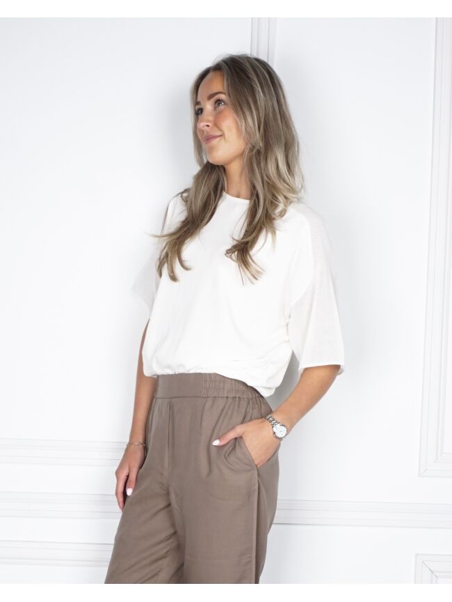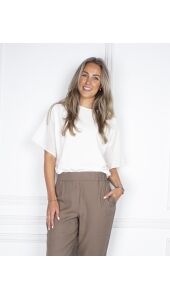 Deze elegante trui heeft een comfortabele, losse pasvorm en een vrouwelijke boothals. De halflange mouwen zijn gemaakt van een semi-transparante stof die een verfijnde twist geeft aan het ontwerp. Afgewerkt met een elastische zoom voor een subtiele blousonlook. Gemaakt van een zachte en soepele stof, ideaal voor een stijlvolle casual outfit.