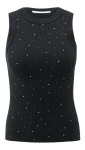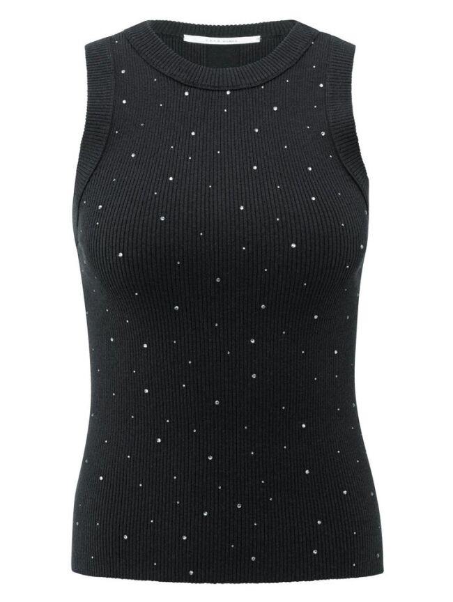 Deze ribgebreide tanktop heeft een flatterende, aangesloten pasvorm en subtiele glinsterende steentjes die een vleugje elegantie toevoegen. De zachte, elastische stof en de ronde hals geven het ontwerp een moderne, vrouwelijke look, perfect voor zowel casual als chique combinaties.