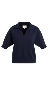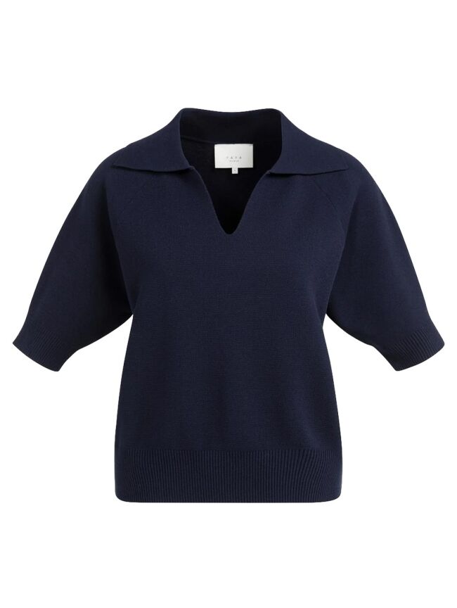 Deze verfijnde trui is gemaakt van een zachte, gebreide stof en heeft een open V-hals met een elegante kraag. De korte mouwen en normale pasvorm zorgen voor een comfortabele, luchtige look. Afgewerkt met ribboorden voor een subtiele structuur. Perfect voor een stijlvolle, casual outfit