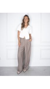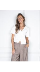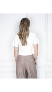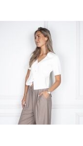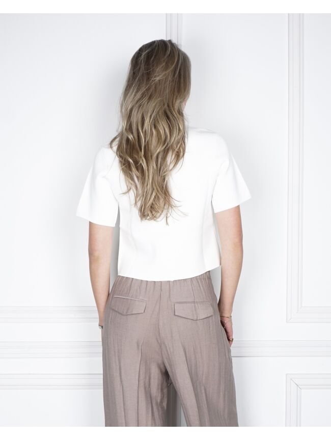 Deze top is vervaardigd uit een stevig gebreid materiaal en heeft een cleane, minimalistische afwerking. Ontworpen met korte mouwen, een V-hals en een aansluitende pasvorm. De subtiele knopen en fijne textuur zorgen voor een elegante look. Het model valt op de heup en is ideaal om gelaagd te dragen of als subtiel statement-item