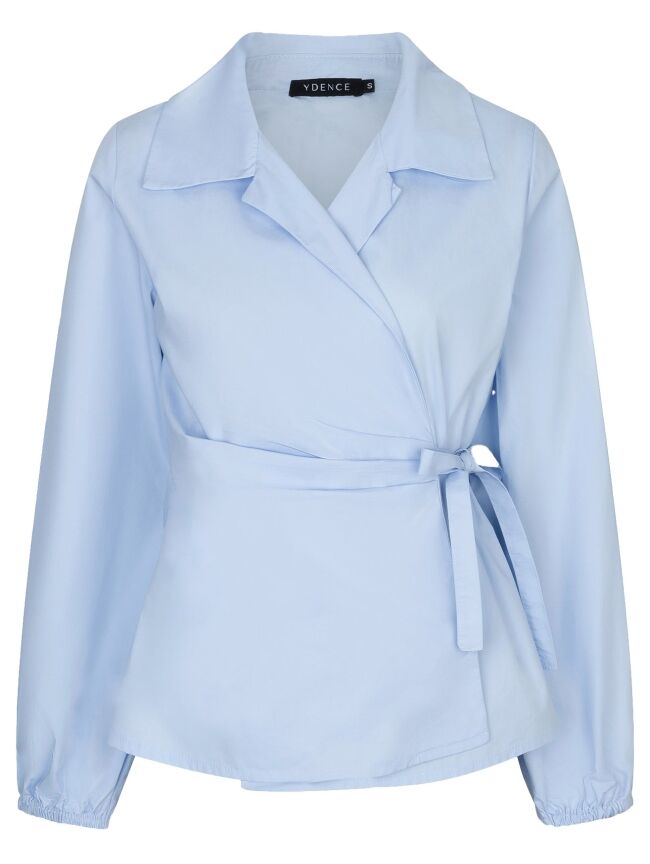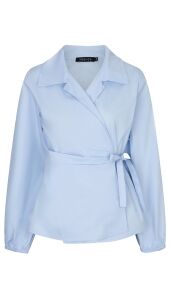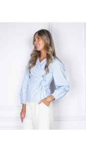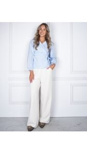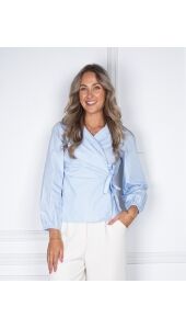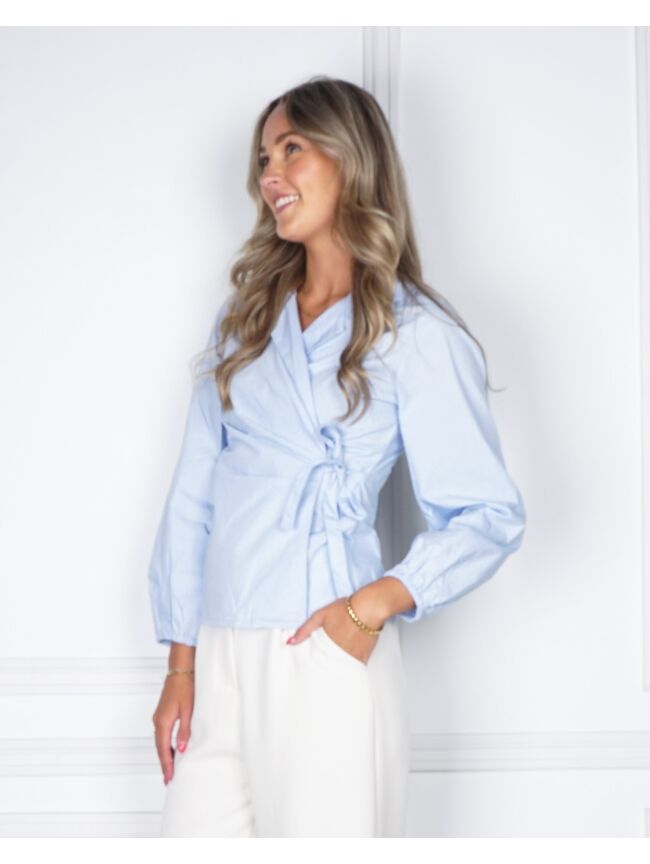 Deze lichtblauwe blouse combineert elegantie met een speels detail. De overslag sluit met een strik aan de zijkant, wat een flatterend silhouet creëert, terwijl de pofmouwen een vrouwelijke, moderne touch toevoegen. Perfect om te dragen naar kantoor met een pantalon of casual te stylen met jeans voor een stijlvolle, relaxed look.